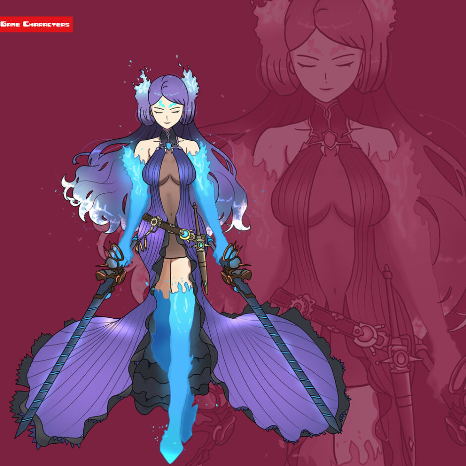 #元素象徴型 #紫基調衣装 #炎状装飾 #透過布意匠 #双剣装備 #長髪キャラ #自然現象融合 #視覚記号性