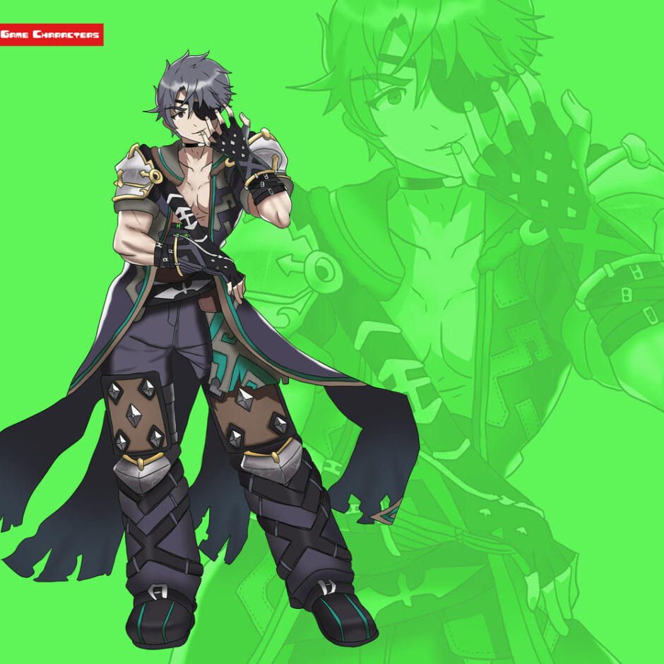 『ゼノブレイド2(2017)』に登場するジークは、短く乱れた灰色の髪を持ち、片目には眼帯を装着している。衣装は黒と茶を基調にした防具的構造で、肩部や膝には金属装飾が配置されている。胸部は大きく開かれており、上半身は布と革の複合デザインで覆われる。脚部は菱形の鋲をあしらった防具風のパーツを備え、全体的に重厚さを伴う。分類としては「装飾防具型」に属し、メレフの儀礼的な軍装意匠と対比すると、より実戦的な外観を示す。