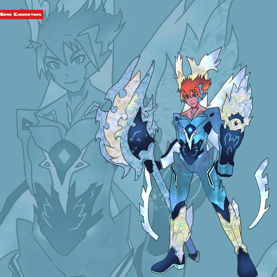 #装飾防具型 #元素象徴型 #氷属性意匠 #大型斧装備 #発光装飾 #水色基調衣装 #炎髪と氷装飾対比 #重装攻撃型デザイン