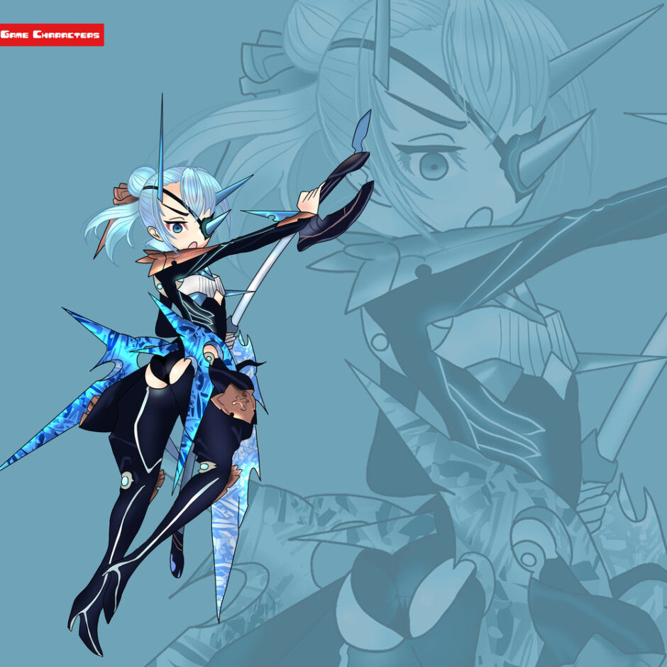 『ゼノブレイド2(2017)』に登場するセオリは、青みがかった髪を結い上げた姿を特徴とするキャラクターである。衣装は黒を基調に、青と白の氷結を思わせる鋭角的な装飾を随所にあしらっている。脚部や背面には氷の結晶を模したパーツが突き出し、武器や衣装と一体化したような鋭い意匠が強調されている。露出の多いデザインながら、全体は氷属性を象徴する装飾と戦闘用スーツの複合構造を持ち、分類としては「装飾防具型」と「元素象徴型」の複合に位置づけられる。同作のツキと比較すると、氷の記号性がより攻撃的かつ動的に表現されている。