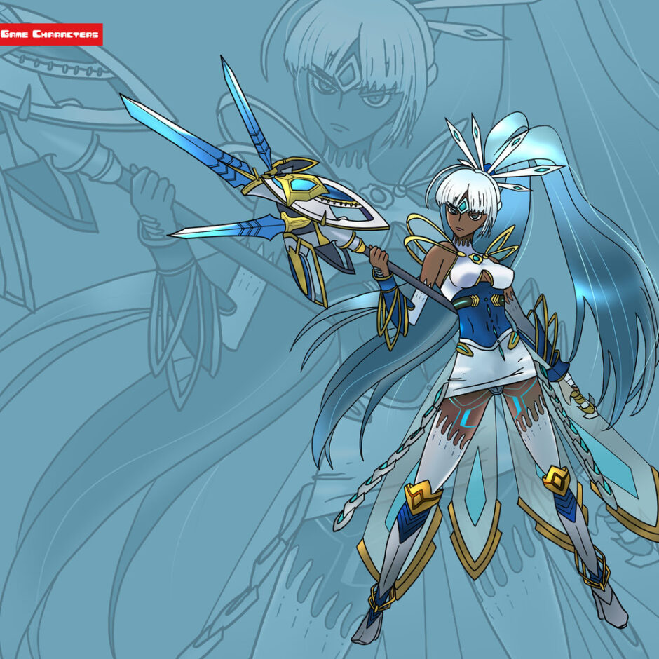 #装飾防具型 #白青基調衣装 #長髪キャラ #槍装備 #金色縁取り #褐色肌キャラ #戦闘儀礼意匠 #装飾的防具構造