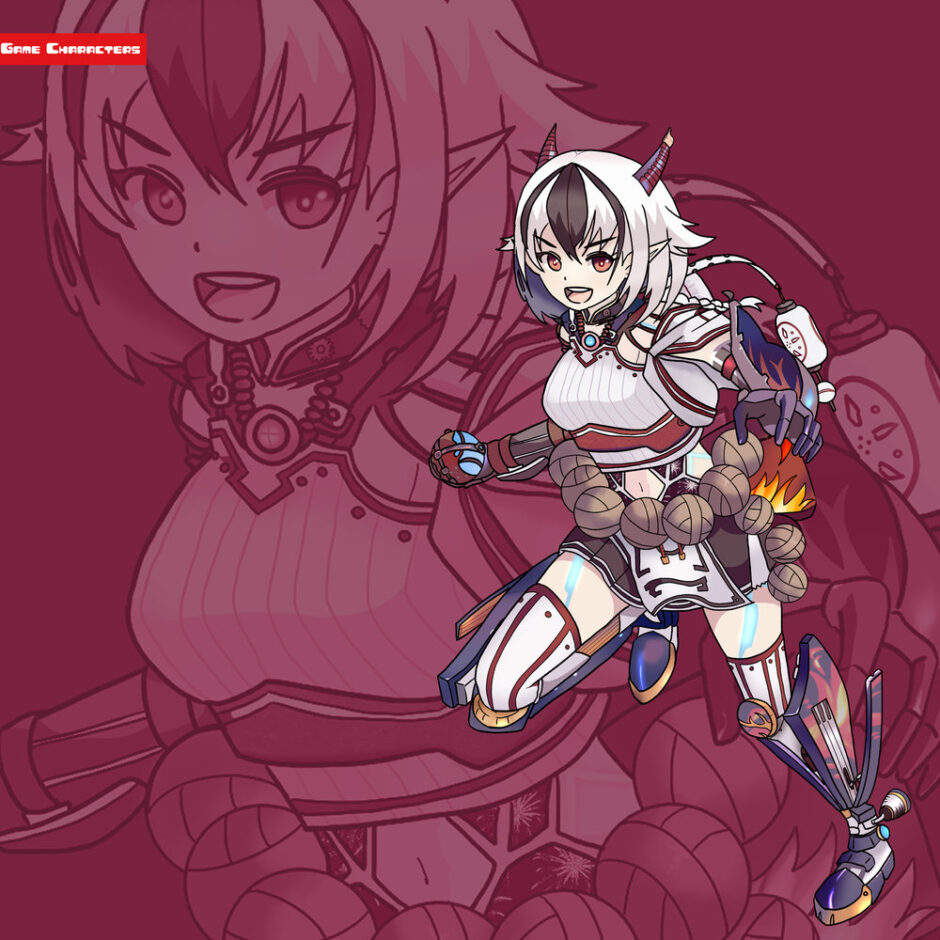 『ゼノブレイド2(2017)』に登場するヒバナは、白髪に赤い目を持ち、頭部に小さな角を生やしたキャラクターである。衣装は赤と白を基調とし、身体の各所に装甲的なパーツが組み込まれている。腰部には大きな数珠のような装飾を下げ、背部には炎を象徴する意匠を伴っている。腕や脚には軽装防具が取り付けられ、全体として機動性と象徴性を両立した構造を示す。分類としては「擬獣化構造」と「装飾防具型」の複合に属し、ニューツやヤエギリと比較すると、より祭礼的かつ炎的要素が強調されている。