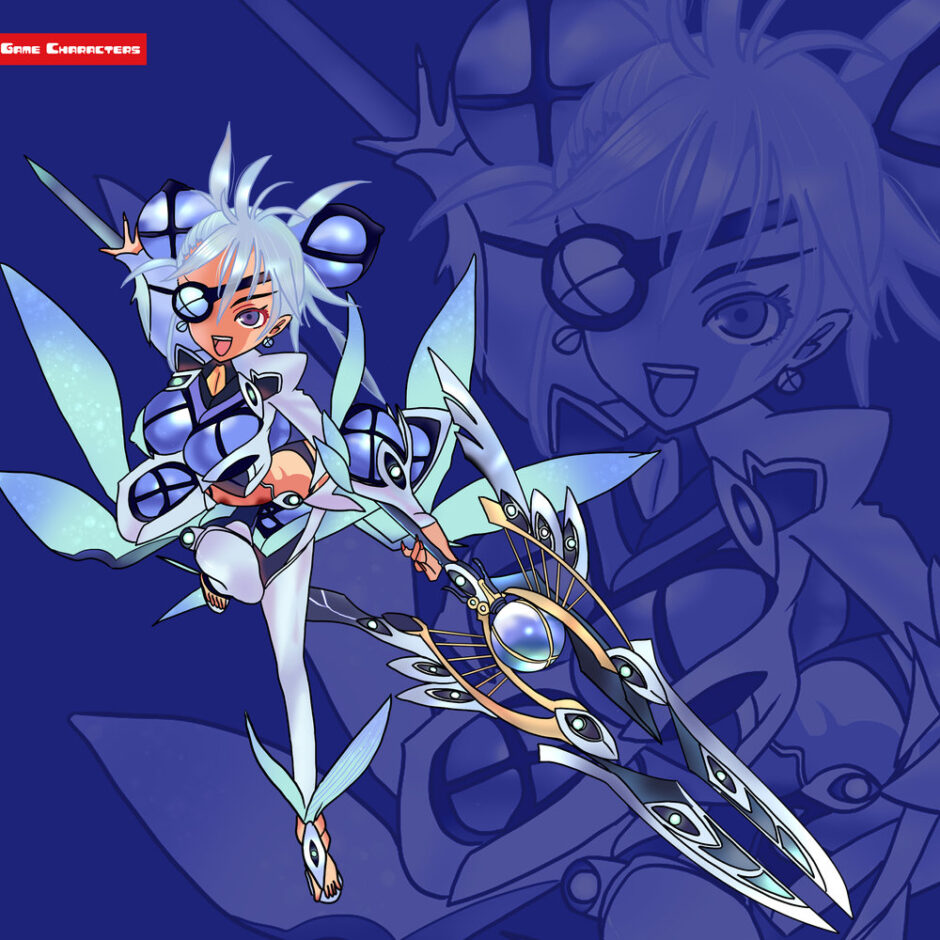 『ゼノブレイド2(2017)』に登場するミクマリは、水色の髪を左右に大きな房状に結い上げ、眼帯を付けた姿が特徴的なキャラクターである。衣装は白と青を基調とした軽装で、各部に透明感のある水滴や羽根を思わせる装飾が施されている。手には青白く輝く杖状の武器を保持し、宝珠を中心に装飾が展開されている。全体は水や流動性を象徴する意匠で統一され、分類としては「装飾防具型」と「元素象徴型」の複合に属する。他キャラのツキやヤエギリと比較すると、より軽快で遊動的な印象を与える衣装構造となっている。