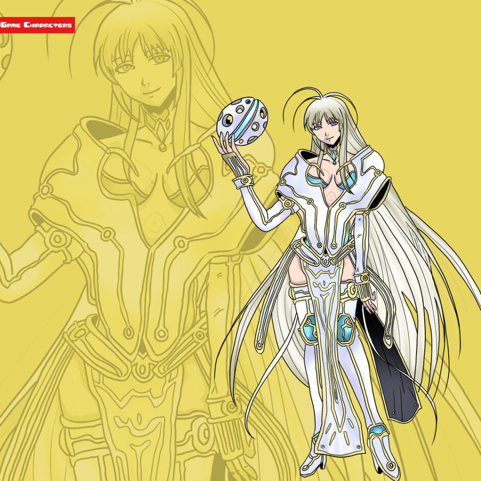 『ゼノブレイド2(2017)』に登場するムスビは、長く流れる白髪を持ち、白と金を基調とした神秘的な装飾衣装を纏うキャラクターである。胸元や脚部には露出を伴いながらも、青い宝石や文様があしらわれた装甲パーツが配置されている。肩や腰の装飾は曲線的かつ左右対称に設計され、全体に流麗な印象を与えている。片手には球体の装飾を持ち、象徴的な意匠を強調している。分類としては「装飾防具型」と「象徴意匠型」の複合に属し、同作品のクビラやカグツチと比べると、より神秘性と装飾性を強調した構造となっている。