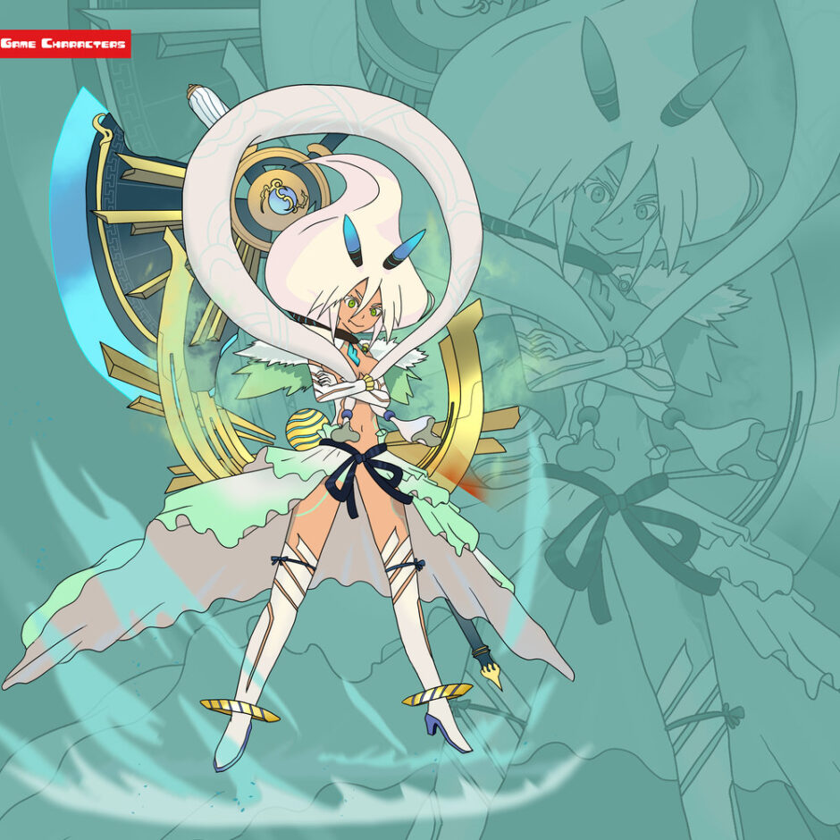 『ゼノブレイド2(2017)』に登場するヤエギリは、白い髪に青い角を持ち、全体に幻想的な装飾を纏ったキャラクターである。衣装は白と淡い水色を基調とし、腰から広がる布地には羽根を思わせる意匠が施されている。背部には巨大な輪状の装飾と刃状の構造が組み合わさり、機械的かつ神秘的な印象を与える。片手には球体の装飾を保持し、全体として象徴的かつ装飾的な存在感を示している。分類としては「装飾防具型」と「象徴意匠型」の複合に属し、ムスビやメノウと比較するとより天体や神話的要素を強調した意匠となっている。