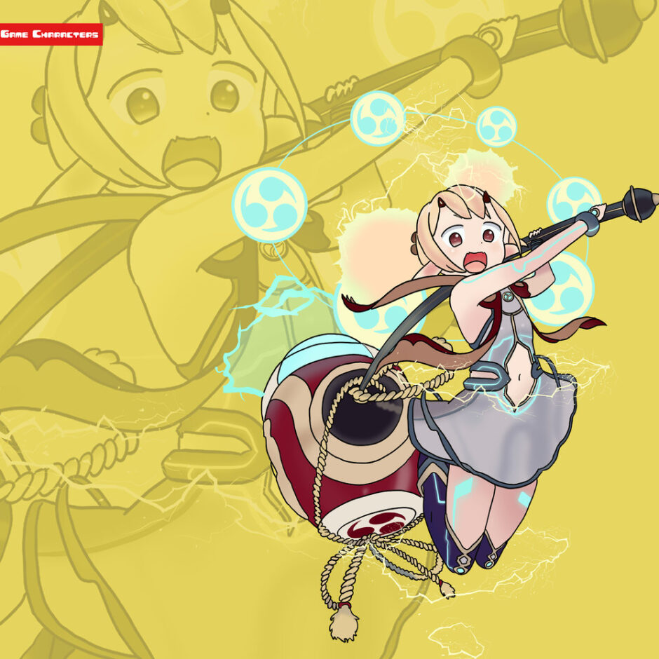 #装飾防具型 #象徴意匠型 #太鼓装飾 #祭礼的デザイン #軽装衣装 #二つ結び髪型 #小柄キャラ #音楽意匠