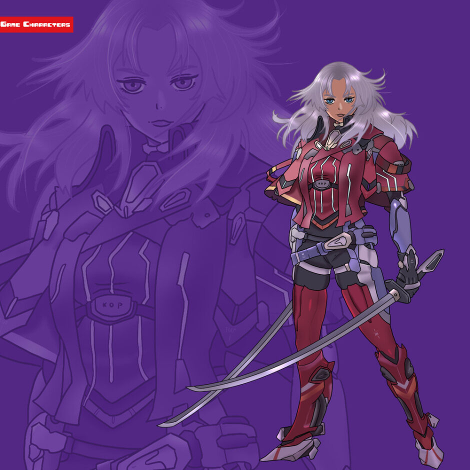 『ゼノブレイド2(2017)』に登場するエルマは、長い銀髪を持ち、赤と黒を基調とした装甲風衣装を纏う女性キャラクターである。胸部から腰部にかけては金属的なパーツが組み込まれており、両脚にも赤い防具を兼ねた装飾が施されている。腕部は左右非対称の装甲で構成され、青みを帯びた機械的意匠が強調されている。腰には二本の刀を帯刀し、全体として機動性を意識した構造となっている。分類としては「人工機械融合型」と「装飾防具型」の複合に属し、KOS-MOS Re:など他の機械融合型キャラと比べると、より武人風の意匠が際立つ。