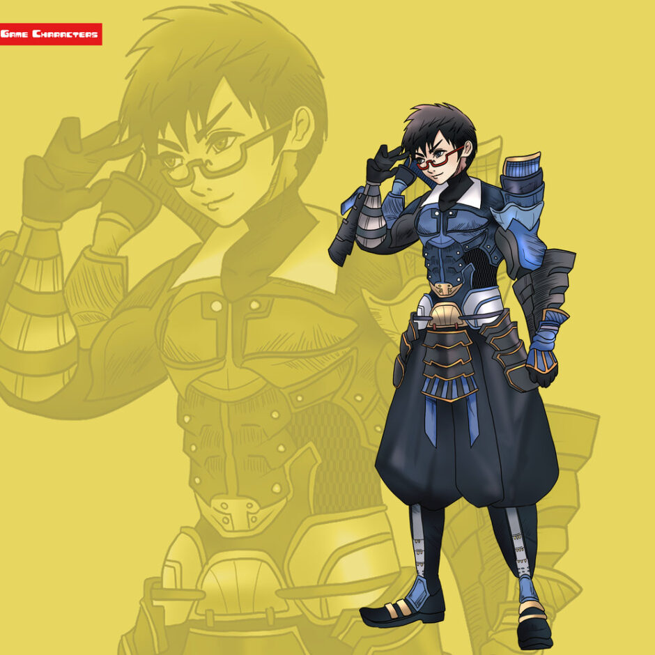 『ゼノブレイド2(2017)』に登場するヨシツネは、黒髪を短く整え眼鏡をかけた姿が特徴的なキャラクターである。衣装は紺と黒を基調とした甲冑風の構造で、胸部から腰部にかけて金属的な装飾を多層的に重ねている。腕部や肩には青の装飾が入り、全体に軽快さと重厚感を兼ね備えた意匠となっている。下半身は和装を思わせる袴状の布で覆われ、脚部には防具が取り付けられている。全体としては「制服融合型」と「装飾防具型」の複合に分類され、ベンケイの和装意匠と比較すると、より近代化された軍装寄りのデザインである。
