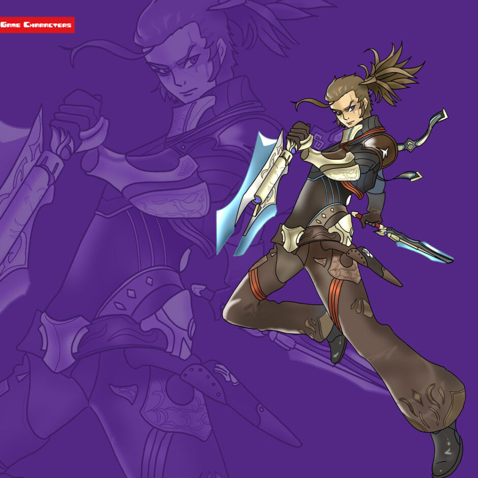 『ゼノブレイド2(2017)』に登場するミノチは、長い髪を後ろで束ねた姿を持つ男性キャラクターである。衣装は黒と茶を基調に、胸部から腰部にかけて軽装の装甲と布を組み合わせたデザインとなっている。肩や腰には装飾的なパーツが配置され、脚部は広がりのあるズボン状の布で覆われている。両手には刀剣を保持し、全体は軽快な動きに適した構造を示す。分類としては「制服融合型」に属し、シンやラウラの衣装構造と比較すると、布要素の割合が高く、武人風の意匠が強調されている。