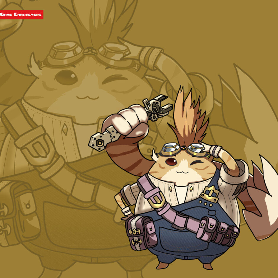 『ゼノブレイド2(2017)』に登場するトラは、丸みを帯びた体格を持つ小型の獣人型キャラクターである。額から逆立つような大きな毛束が特徴で、頭部にはゴーグルを装着している。衣装は青色のオーバーオールに工具ベルトやポーチを複数備え、腕や背部には機械的装置を装飾的に取り付けている。全体は「擬獣化構造」と「作業服融合型」に分類され、他キャラの防具的デザインと比べて実用的かつ職人的な構造が目立つ。