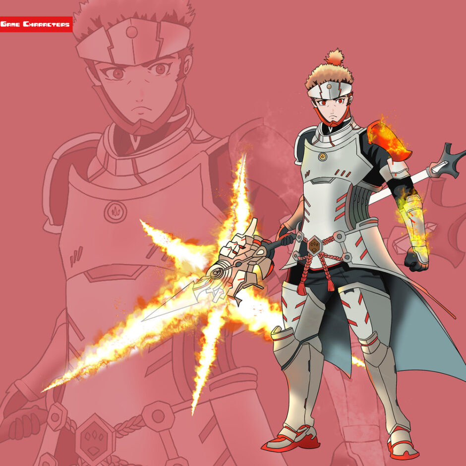 『ゼノブレイド3(2022)』に登場するカムナビは、短髪を頭頂で結んだ髪型を持ち、額には白い鉢巻きを巻いている。衣装は白と灰色を基調とした全身鎧で、胸部や腰部には赤いラインが施され、帯状の装飾が結び目として強調されている。腕部は黒いインナーに覆われつつ、右腕全体に炎のようなエフェクトが纏わりつくデザイン。脚部は硬質な装甲で守られ、外套状の布地が腰から背面に広がっている。手には炎を帯びた大型の剣を握り、全体は「儀礼重装融合型」に分類され、同作のエセルの戦闘装甲融合型と比較すると、より力強く象徴的な意匠が際立っている。
