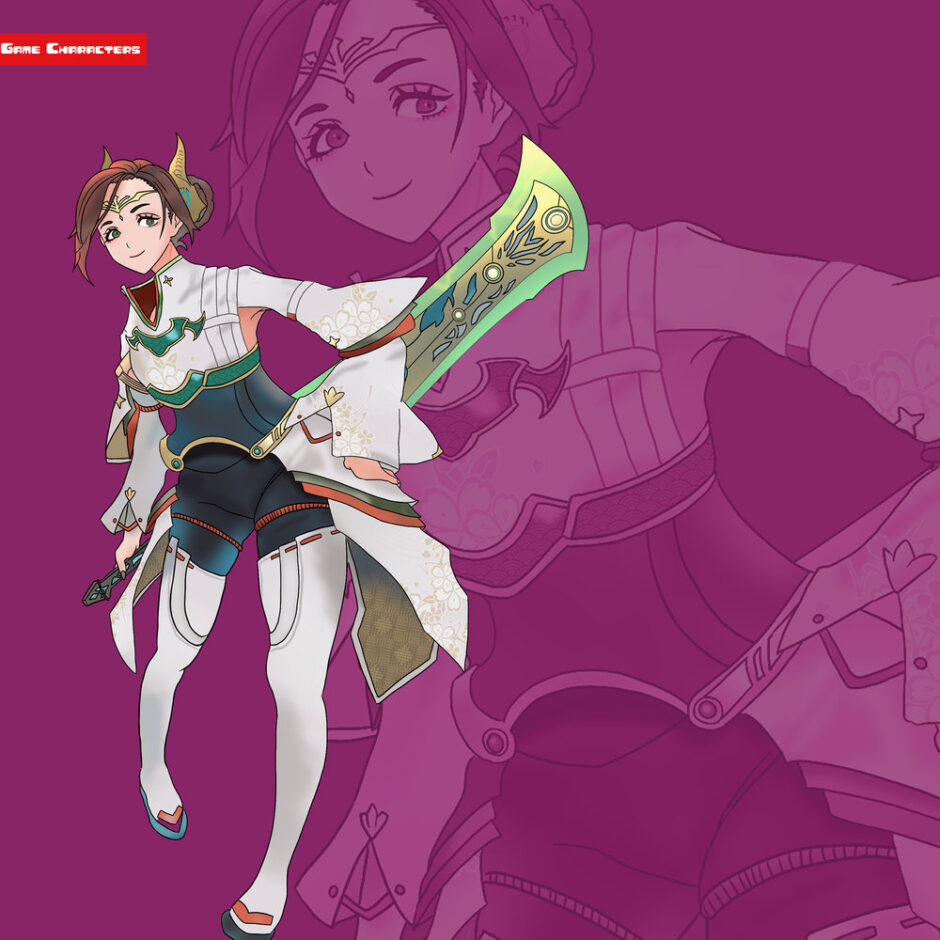 『ゼノブレイド3(2022)』に登場するニイナは、赤茶色の髪をまとめ上げ、頭部に角状の装飾を備えている。衣装は白を基調とした上着に金や緑の装飾が施され、袖は広がりのある和装風の形状を持つ。腰部にはベルトが配置され、上下の衣装を連結する機能を果たしている。脚部は黒のショートパンツと白のタイツを組み合わせ、動きやすさと装飾性を両立。背中には大剣を保持し、刀身は緑や金色の意匠が輝いている。全体は「和装重装融合型」に分類され、同作のアシェラの軽装戦闘融合型と比較すると、より儀礼的で力強い構造が特徴となっている。