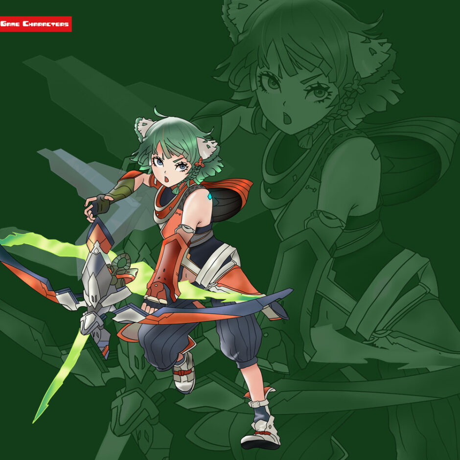 『ゼノブレイド3(2022)』に登場するユズリハは、短めの緑髪を外向きに流し、頭部には獣耳状の装飾を備えている。衣装は赤と黒を基調とした軽装で、肩や胸部には布と装甲を組み合わせた非対称的な構造を持つ。腰回りには布地を重ねたスカート風のデザインが施され、脚部は膝下が露出しつつも動きやすさを意識した構造になっている。手には機械的な意匠を持つ大型の弓を携え、光を帯びた矢を放つデザインが特徴的である。全体は「擬獣化戦闘融合型」に分類され、同作のミオの制服擬獣化融合型と比較すると、より狩猟的・機動的な構造が強調されている。