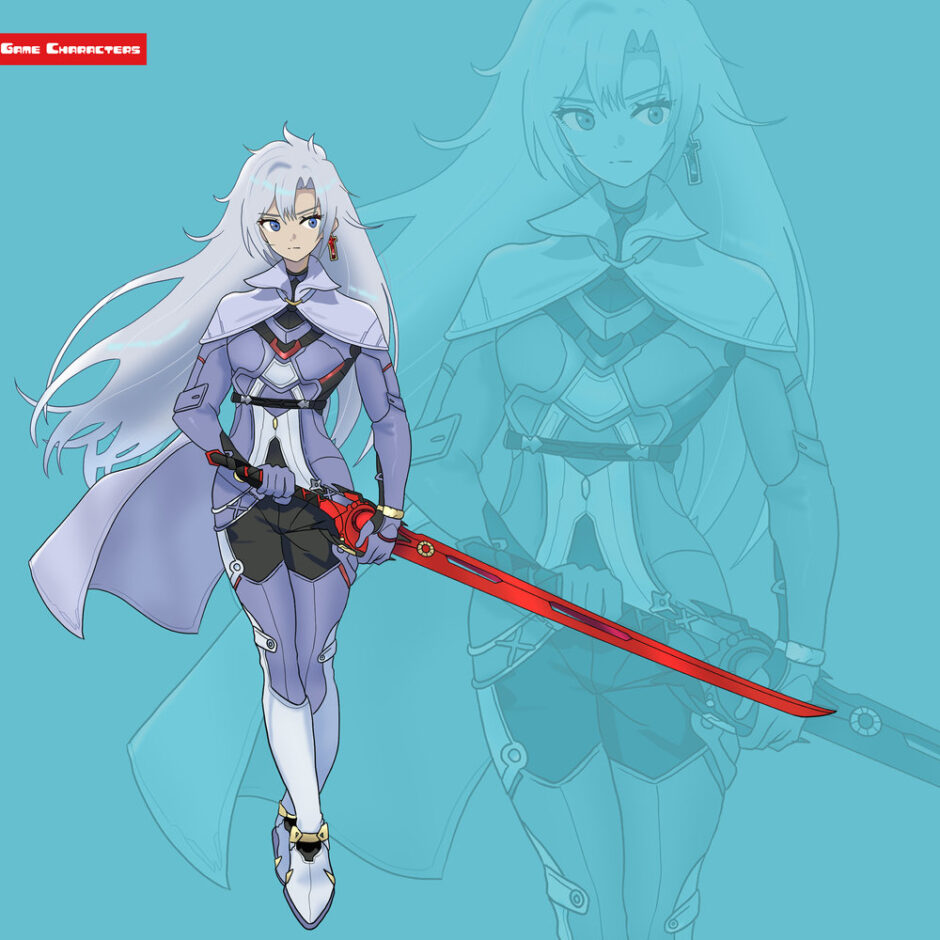 『ゼノブレイド3(2022)』に登場するエイは、白銀色の長髪を背に流し、額には装飾的なパーツを備えた姿を持つ。衣装は紫を基調とした戦闘服で、胸部や腰部は硬質な装甲で補強されている。肩からはマント状の布地が広がり、全体を覆うシルエットを形成。脚部は密着型のスーツとブーツで構成され、可動性を保ちながら防御力を示す意匠となっている。手には赤色の長剣を携え、武装と衣装が一体化した重厚な印象を与える。構造分類は「戦闘装甲融合型」に属し、同作のエセルの戦闘装甲融合型と比較すると、より威厳と象徴性を意識したデザインが見られる。