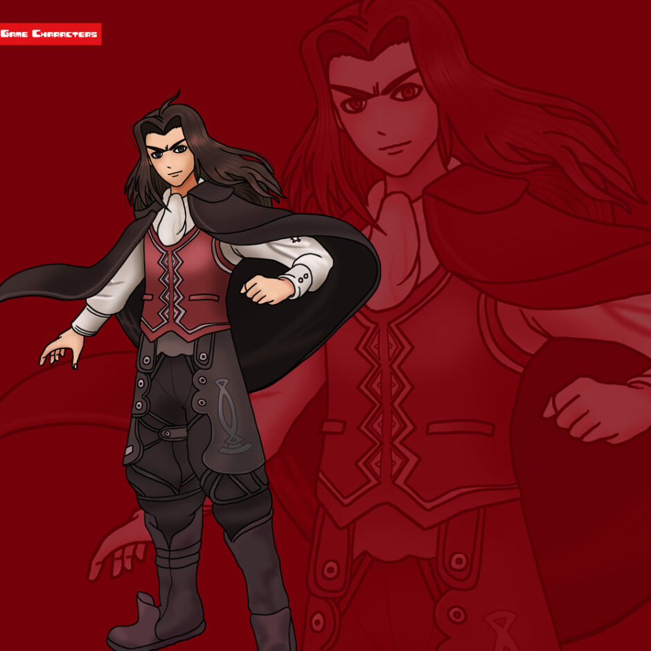 『ゼノブレイド(2010)』に登場するダンバンは、長く流れる黒髪を後方に整えた姿を持つ。衣装は白いシャツに赤いベストを重ね、その上から黒いマントを羽織る三層構造。胸部のベストは装飾的な縫い目とボタンを持ち、フォーマルな要素を強調している。下半身は黒を基調としたパンツに金具や模様を組み込み、実用性と装飾性を併せ持つデザイン。袖口や腰回りの布地はゆとりを残しつつも、全体として引き締まったシルエットを形成している。構造分類は「礼装融合型」に属し、同作のシュルクの軽装構造と対比すると、より威厳を強調した装いとなっている。