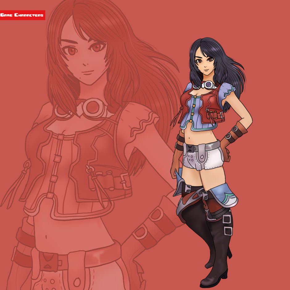 『ゼノブレイド(2010)』に登場するカルナは、長い黒髪を後方に流した端正な髪型を持つ。上半身は赤いベスト型のジャケットに水色の装飾を合わせ、袖や裾は曲線的に裁たれている。腹部は露出し、腰回りは白基調のショートパンツに金属パーツを組み込んだ構造を持つ。両腕には革製のバンドや金具が配置され、視覚的に装備感を強調している。脚部は片足を黒いブーツとガードで覆い、もう片方は軽装でまとめた非対称構造となっている。全体として「機械装飾融合型」の衣装分類に属し、同作内のシュルクらの軽装系デザインとの対比が際立つ。