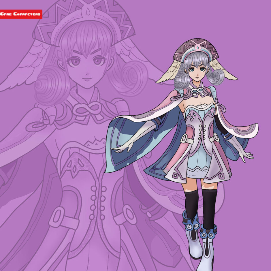 『ゼノブレイド(2010)』に登場するメリアは、銀髪を大きく巻いたツインサイド風にまとめ、頭部には羽状の装飾を備えた冠状のヘッドギアを装着している。上半身は白と淡い紫・青を基調とした衣装で、胸部から腰にかけて複数のボタンや曲線的な縫製が連続し、礼装と装飾衣を融合させた構造を持つ。肩からは大きく広がるマントを羽織り、袖は布地が分離しつつも外套と連動するデザイン。腰部から裾にかけては幾何学模様とパネル状の装飾が重ねられ、全体に統一感を与えている。構造分類は「儀礼装融合型」に属し、同作のフィオルンやカルナの軽装系構造と対比すると、儀式的かつ装飾的要素が強調されている。
