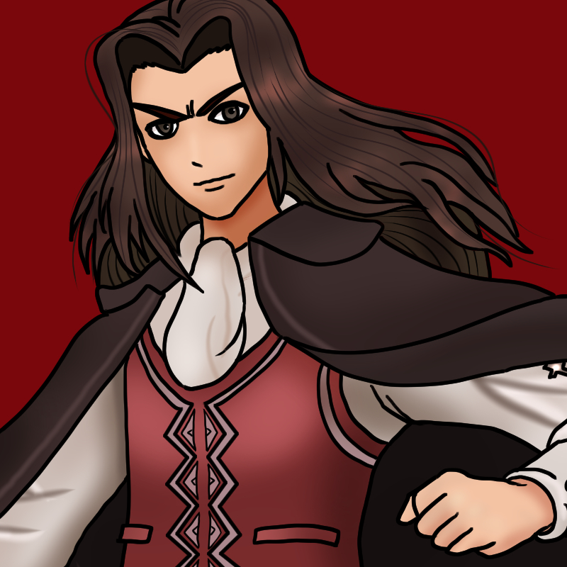 『ゼノブレイド(2010)』に登場するダンバンは、長く流れる黒髪を後方に整えた姿を持つ。衣装は白いシャツに赤いベストを重ね、その上から黒いマントを羽織る三層構造。胸部のベストは装飾的な縫い目とボタンを持ち、フォーマルな要素を強調している。下半身は黒を基調としたパンツに金具や模様を組み込み、実用性と装飾性を併せ持つデザイン。袖口や腰回りの布地はゆとりを残しつつも、全体として引き締まったシルエットを形成している。構造分類は「礼装融合型」に属し、同作のシュルクの軽装構造と対比すると、より威厳を強調した装いとなっている。